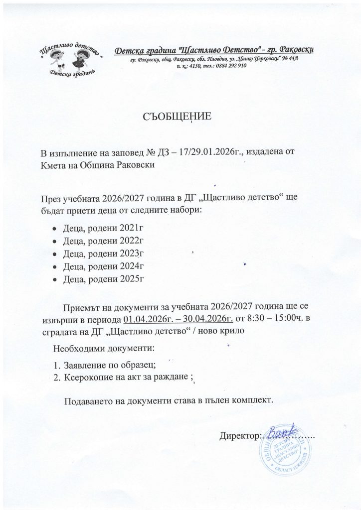 От Величка Кирчева Печева – Директор на ДГ „Щасливо детство“, гр. Раковски
